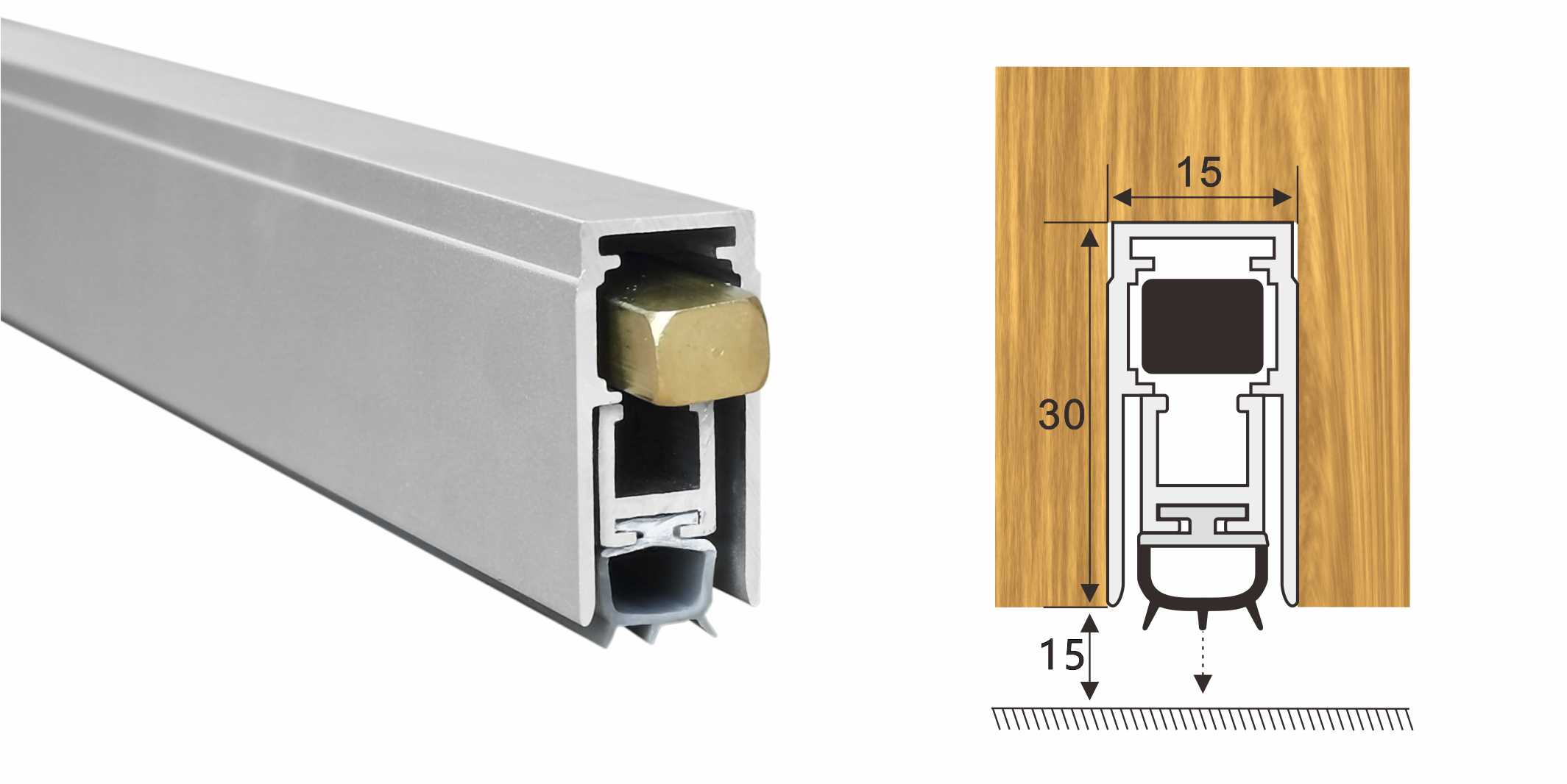 嵌入式門底自動(dòng)升降式密封器,M型彈簧結(jié)構(gòu),適用于門扇內(nèi)開槽的門。安裝時(shí)需在門底有一個(gè)30mm*15mm的通槽,將產(chǎn)品放置其中,將兩端蓋板和密封器用螺絲固定,使用本產(chǎn)品不影響門的整體風(fēng)格。