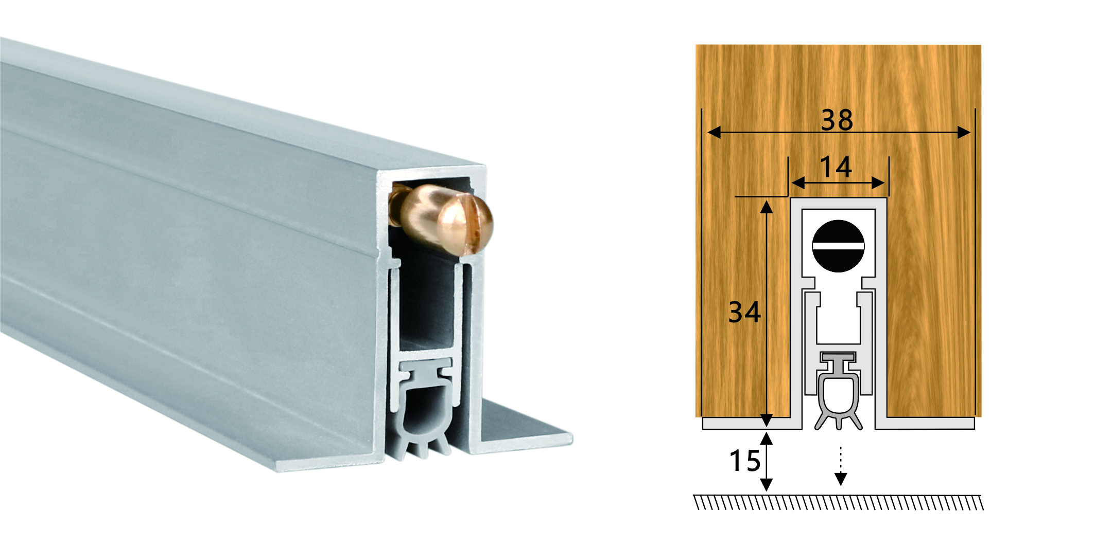 嵌入式門底自動升降式密封器,四連桿機構,適用于門扇內開槽的門。安裝時需在門底有一個34mm*14mm的通槽,將產(chǎn)品放置其中,將兩端蓋板和密封器用螺絲固定(或用螺絲從密封條底部向上固定),使用本產(chǎn)品不影響門的整體風格。