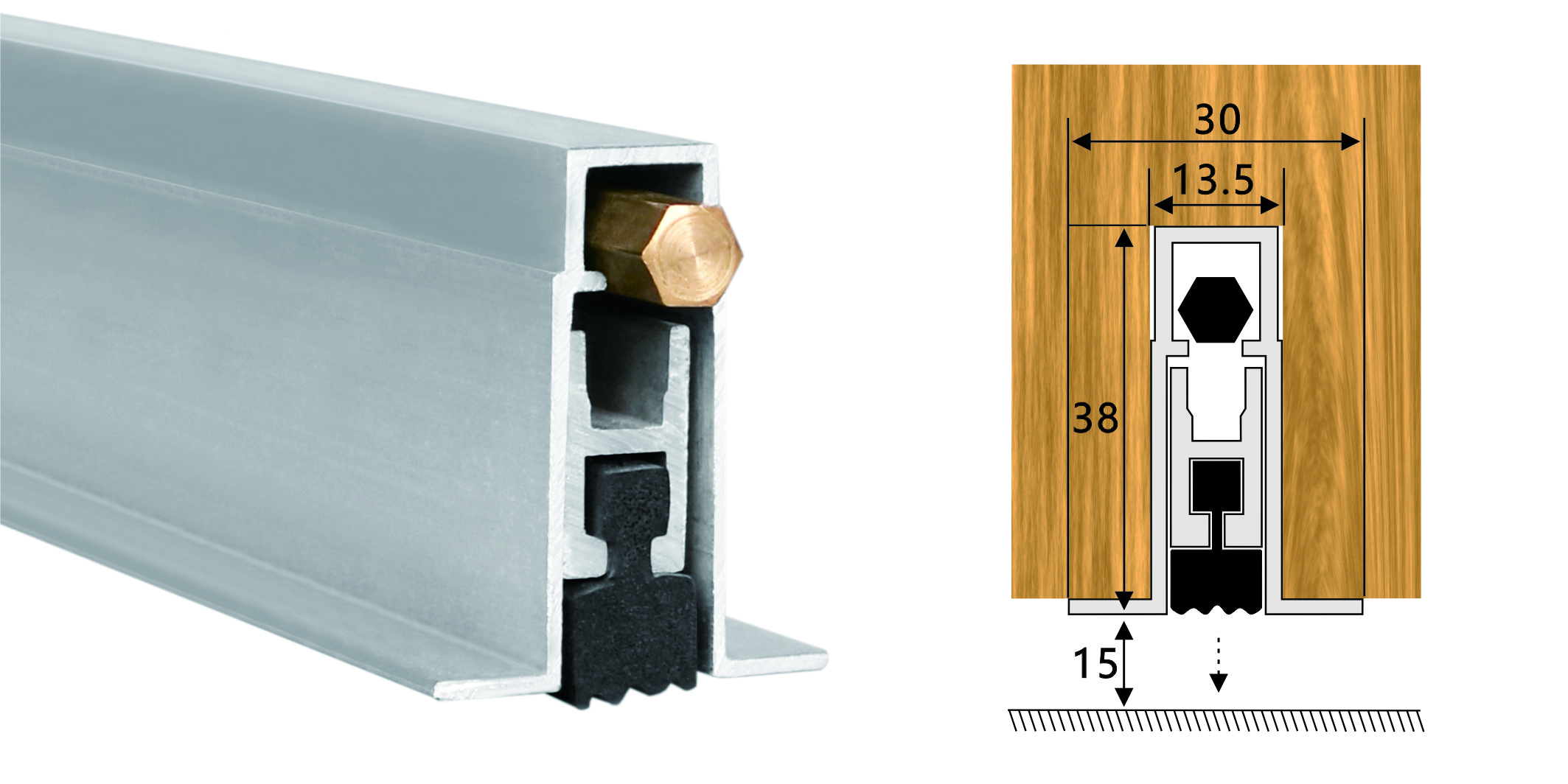嵌入式門底自動升降式密封器,M型彈簧結(jié)構(gòu),適用于門扇內(nèi)開槽的門。安裝時需在門底有一個38mm*13.5mm的通槽,將產(chǎn)品放置其中,從產(chǎn)品的翼上固定,并將裝飾端蓋板用螺絲裝上,使用本產(chǎn)品不影響門的整體風(fēng)格。